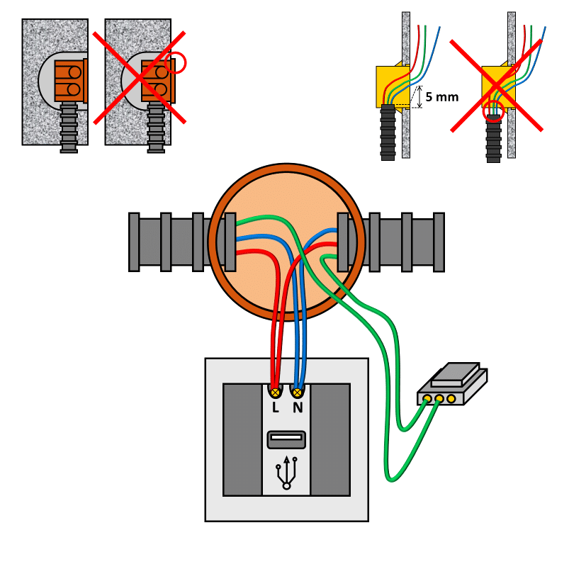 Branchez les fils de phase (rouges) sur la borne L de la prise USB.
