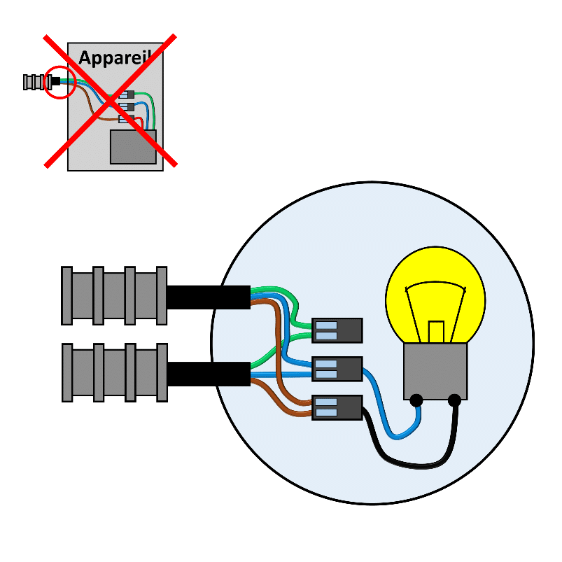 Assurez toujours la continuité du fil de terre en branchant les fils verts / jaunes à un connecteur automatique si les appareillages ne possèdent pas de borne prévue à cet effet.