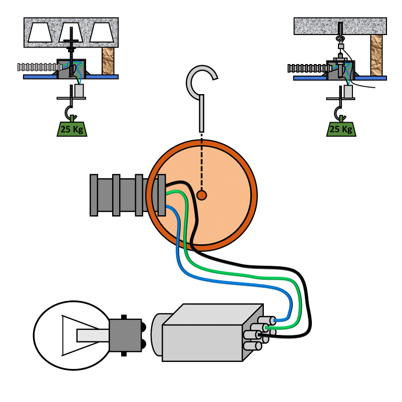Le crochet du dispositif de connexion de luminaire doit résister à la suspension de 25 Kg.